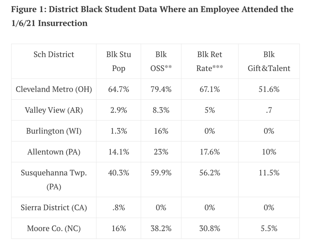 If we consider the track record of schools where an employee attended the insurrection, we find that Black students in just about all of them are disproportionately suspended, retained, and are underrepresented in gifted and talented courses (see figure 1).