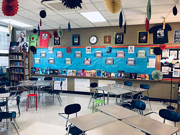Paper fans of every color hang from each ceiling tile. Banners with quotes from all of my favorite authors line the classroom walls, as well as AP English T-shirts created by students in previous years. In fact, there isn’t an inch of wall space untouched by additional posters filled with grammar and writing tips, resources for spotting fake news, not to mention my most prized pieces of wall decor—student art work.