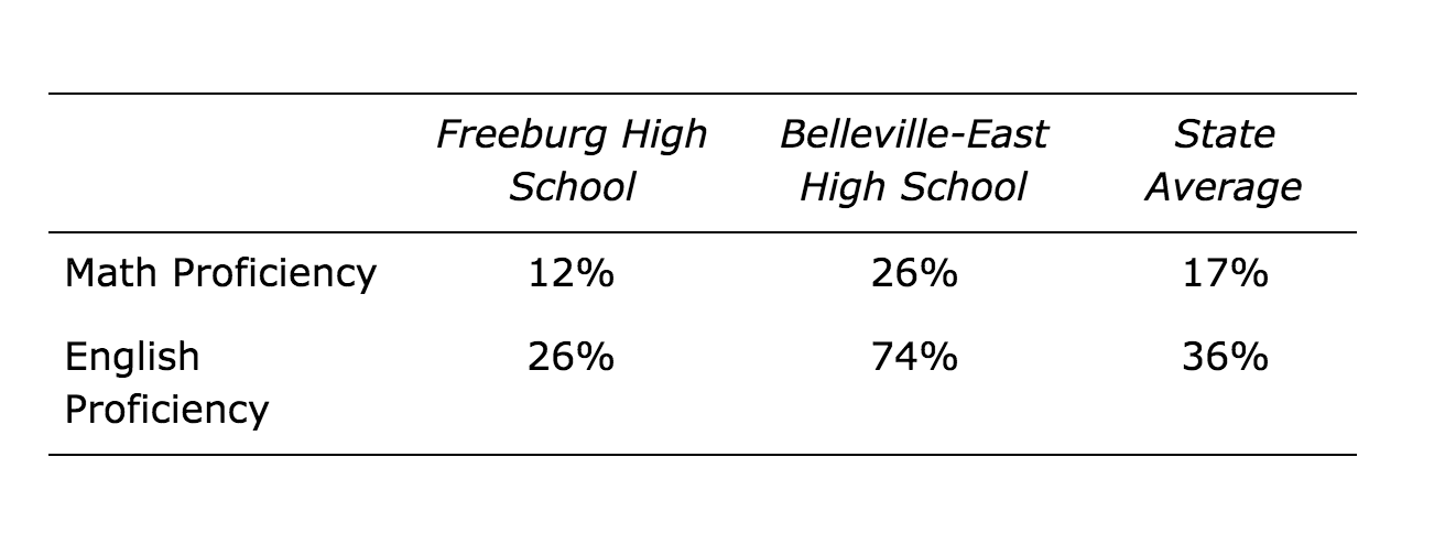 Based on 2016 test scores provided by GreatSchools.org, only 12 percent of Freeburg students are proficient in math and 29 percent are proficient in English. Both are lower than the state averages of 17 percent and 36 percent, respectively. Astonished by these results, I asked my parents what informed their decision to choose Freeburg High over other districts. They said they mostly relied on what people in the area told them. But if Freeburg High is seeing results below the state average, why do so many believe it is a good school? Out of curiosity, I dug deeper and compared Freeburg High to the other major local high school, Belleville-East. The results were astounding.