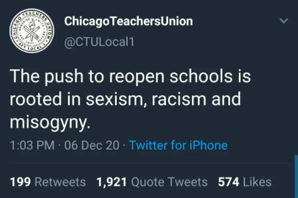 So what will our new leader do? He says he’ll be driven by science so you’d think he’d listen to the scientist. But how will he placate an Education Secretary who supports the powerful Chicago Teachers Union, which tweeted this absurdity (and later deleted it) on Monday?