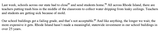 To her credit, Raimondo did make mention of an urgent problem in our schools that needs fixing and will cost $1 billion. [pullquote position=”right”]Our school buildings are literally crumbling[/pullquote] because of decades of disrepair, Band-Aid fixes, and a pitiful culture of caring about kids by kicking the can down the road. So good on the Governor for tackling this huge and costly nightmare that has been desperately waiting for a leader. The condition of our schools, the places where our children are forced to spend their days, is an abomination.