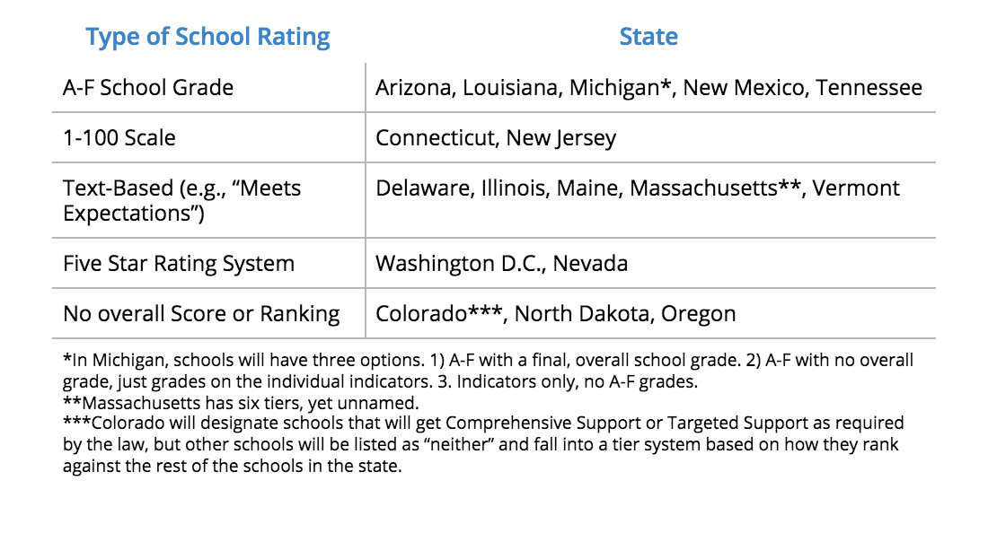 For the most part, what states measure for school quality has already been decided by federal law under the Every Student Succeeds Act. Every state, for example, has to track student test scores to see if they’re performing on grade level. Everyone has to look at graduation rates and step in if a school drops below 67 percent. And everyone has to give schools credit for helping students grow academically, even if they’re not on grade level. But how they measure it is largely up to each state. There’s more flexibility in which students they track, what non-academic qualities of a school they’ll measure, and how easy or hard they’ll make it for schools to get a good rating. States also control what actions they’ll take for those most in need and how to report all this information to parents, and back to the federal government. With 17 state education plans turned into the U.S. Department of Education so far, it looks like most states will count most students from traditionally disadvantaged groups—students with disabilities or low-income students, for example. Many states are also sticking with research-based ideas for the non-academic qualities of a school they’ll measure: Student attendance, and signs that they’re making it in college or on track to get there. But students can still slip through the cracks. The school rating system holds the key to the entire plan’s success. A few are getting it mostly right (D.C. and Tennessee stand out), but many are setting low bars for schools to be considered good. Many are developing complicated reporting systems that risk alienating parents, and some have even left important pieces “To-Be-Determined,” like what earns a school the highest rating vs the second highest.
