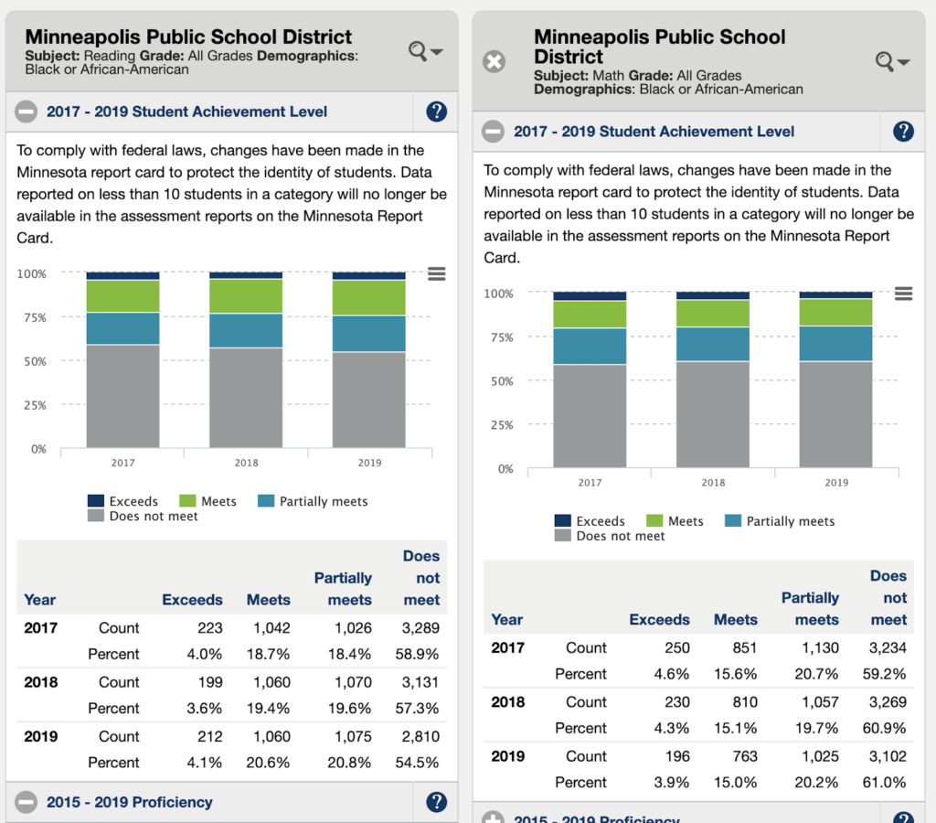 In Minneapolis, 76% of Black students fail in reading proficiency compared to just 21% of White students. And 81% of Black students in Minneapolis come up short on math tests.