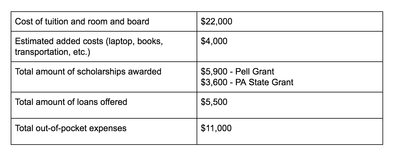 I didn’t magically come to this understanding. It took seeing the truth before my very eyes to understand the fallacy of the bootstrap American Dream ethos which holds that if someone simply works hard enough, they can attend college and earn financial security through a good paying job. Every spring, seniors in our high school in West Philadelphia bring a member of their families into school to have their financial fit meetings. They come armed with their financial aid award letters that specify college costs, offered loans and awarded scholarships. With a teacher, students input this data into a spreadsheet that helps calculate total out-of-pocket costs. A common student’s data for an in-state public college might look like the following: