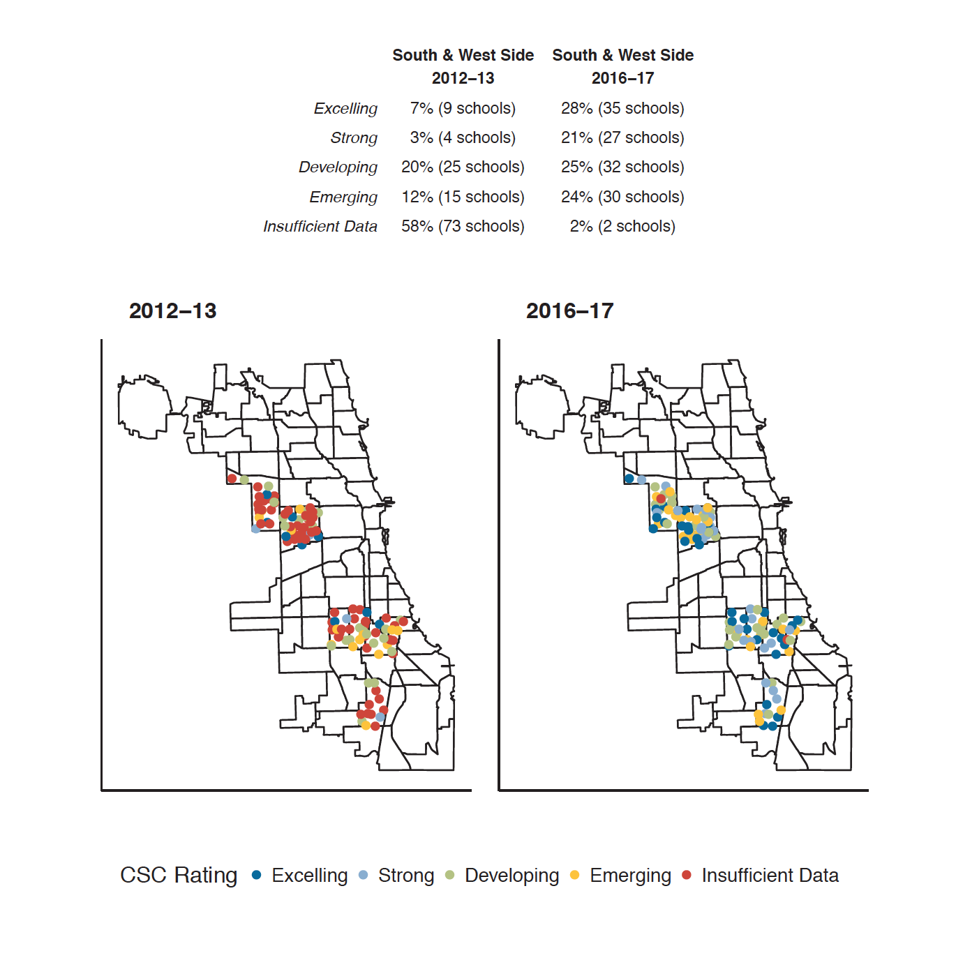 First of all, the quality of information we have on arts education in Chicago is improving. This year, 97 percent of the city’s public schools took part in Ingenuity’s arts education survey, an all-time high. Charter schools—which have been less likely to report data—are getting into the game, too. From 2016 to 2017, charter schools’ survey participation rose from 67 percent to 91 percent. They have also made strides in improving the quality of their arts programs. The share of charter schools rated strong or excelling rose from 39 percent in 2016 to 57 percent in 2017. Today, 73 percent of students enrolled in Chicago Public Schools attend a school rated strong or excelling—the top two categories—of Ingenuity’s Creative Schools Certification scale. The scale measures a school’s staffing, time for arts instruction and, at the high-school level, number of arts disciplines offered. Although one-third of Chicago’s public school students still lack the depth of exposure to the arts envisioned by the arts plan, equity of access to arts programs appears to be improving.