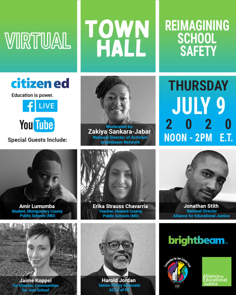 On Thursday, July 9 from 12:00-2:00 p.m. ET, brightbeam’s Director of Activism, Zakiya Sankara-Jabar will moderate a virtual town hall called #ReimagingingSchoolSafety.