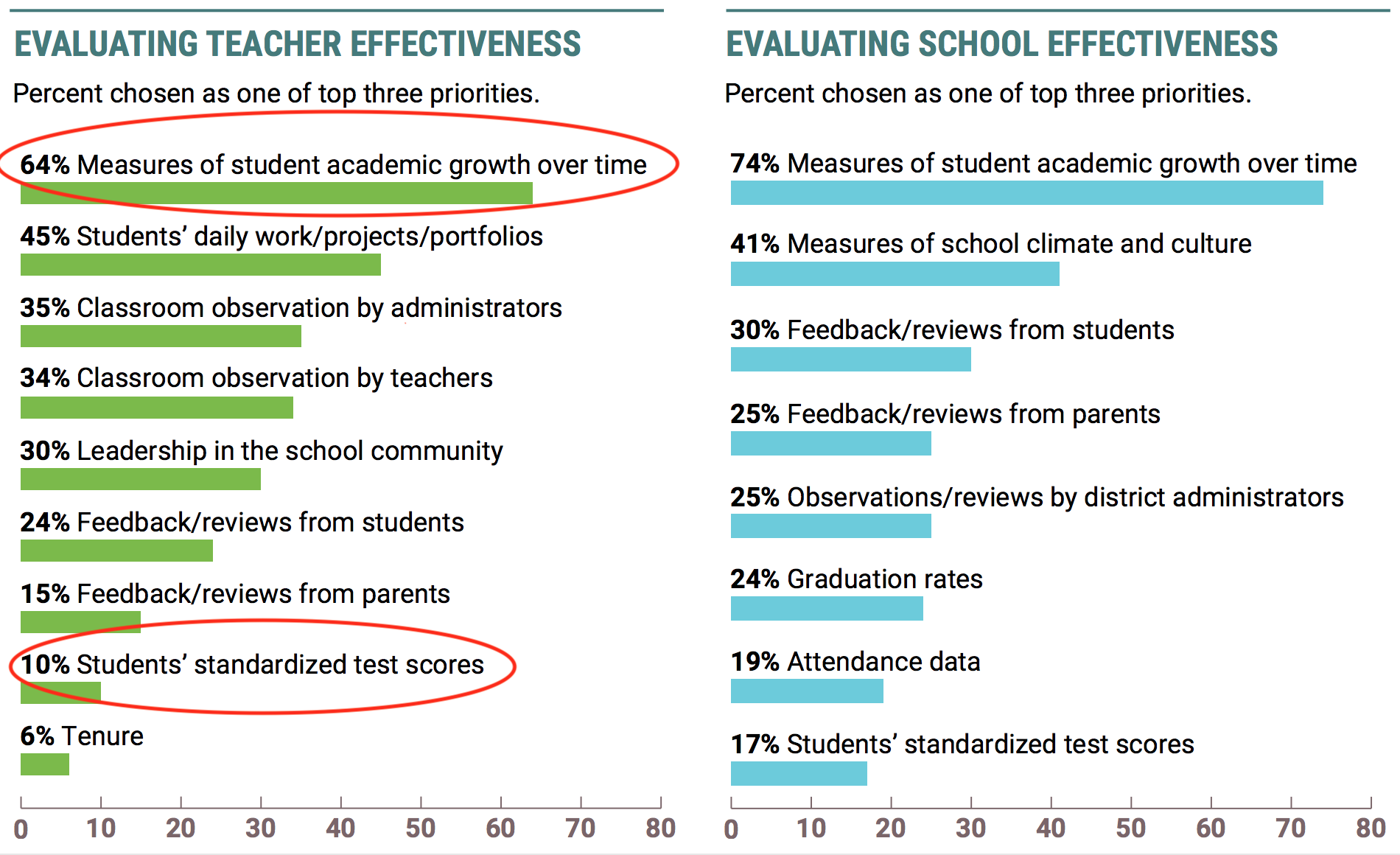 Dear Teachers, I just read some of the results of a survey and I’m confused. The good people over at Educators for Excellence asked a bunch of you how you feel about accountability and school choice and the answers seem to contradict each other. Now let me first say that I’m not an educator. I’m more like a professional student of our public school systems. I love getting insights like the kinds found in this E4E survey. So please take this letter in the spirit I’m writing it. Help me understand better what you’re thinking. A majority of you said that looking at student growth from the beginning to the end of the school year was the “most valuable” thing when it comes to measuring how effective you are as a teacher. It’s also the most valuable thing for judging the quality of a school. When I first saw this I was kind of shocked. I’ve seen a lot of teachers, or maybe really just teachers union spokespersons and allies, rail against pretty much any form of accountability, especially anything that links student achievement and teacher evaluations, so [pullquote position=”right”]to see more than two-thirds of you choose student growth was kinda thrilling.[/pullquote] Student growth is important to me too because I think teachers and schools should get credit for helping kids progress academically even if the students don’t make it to grade level by the end of the year. But then I had to scratch my head when I noticed, near the bottom of the list, standardized tests. It was second to last with only 10 percent of you thinking it was a good way to measure a teacher’s effectiveness or a school’s quality. Now before you tell me that a test is incomplete and doesn’t give you a full picture, let me just say that I agree. I’m guessing the people who wrote the survey agree too, because they asked teachers to pick the top three things they think go into making a good teacher evaluation. Literally nobody thinks one single measure is a good idea.