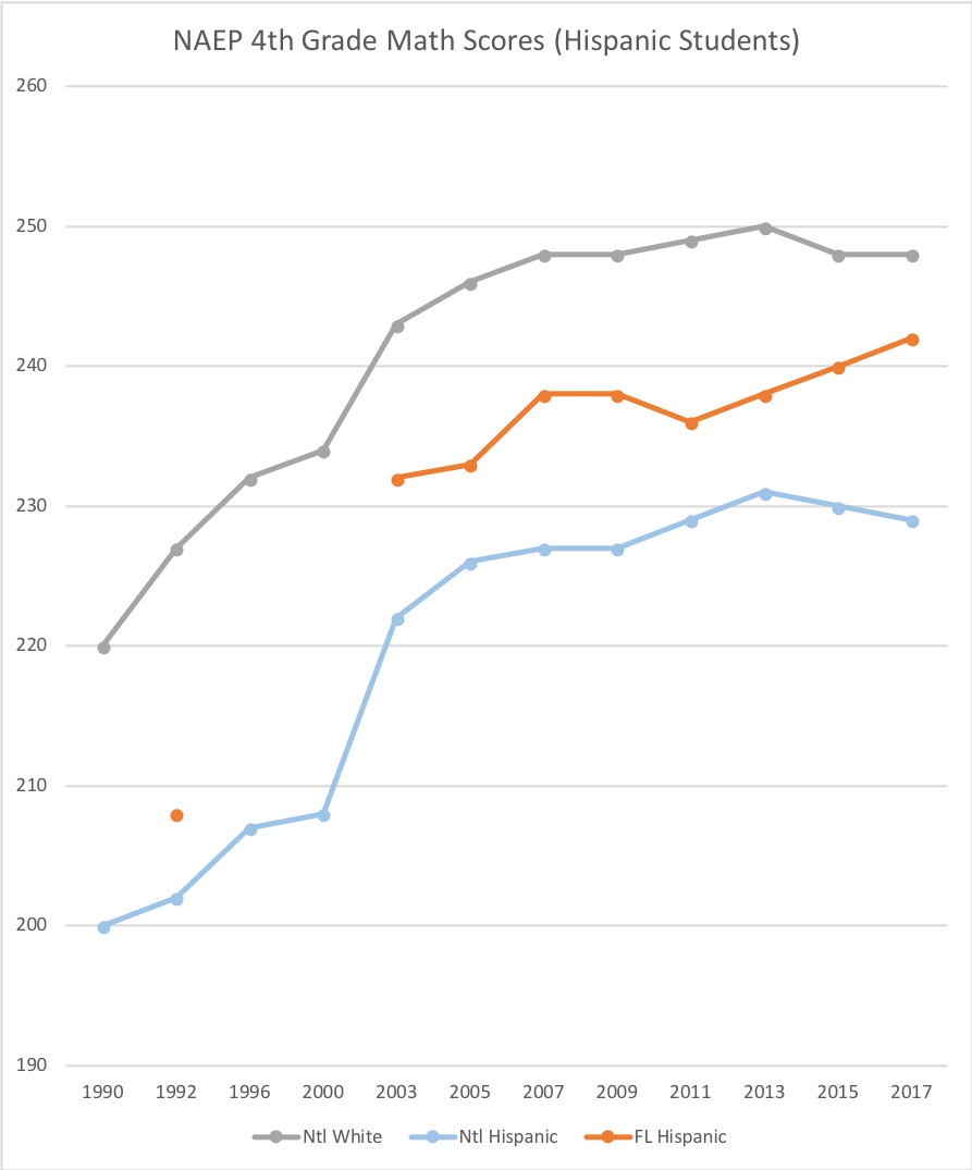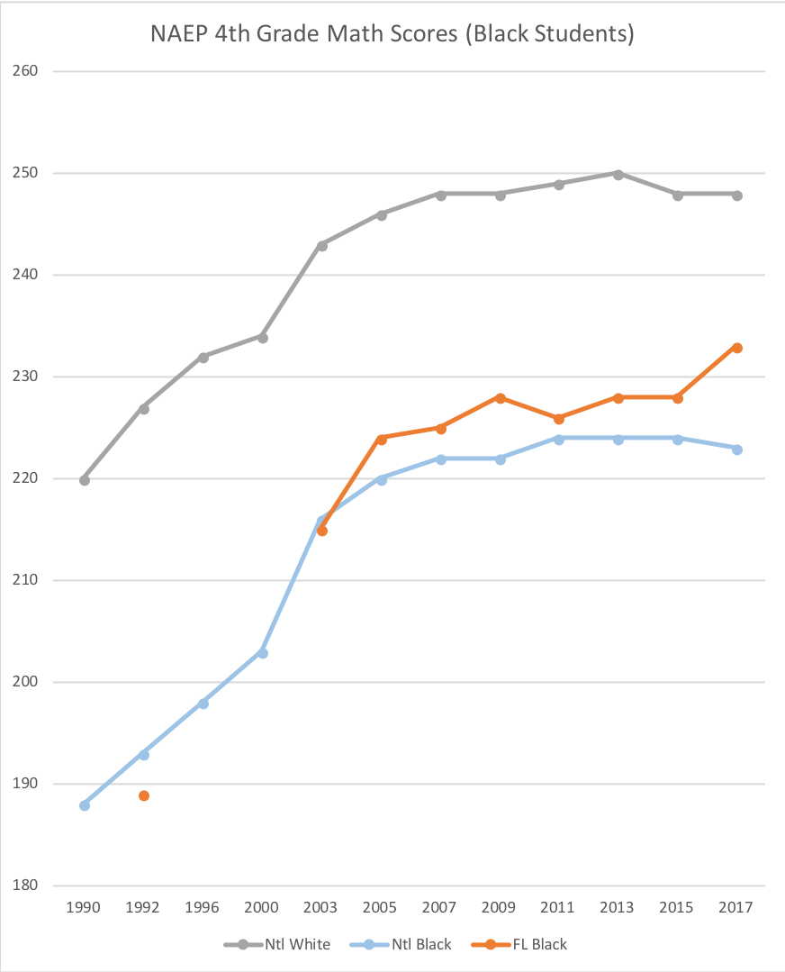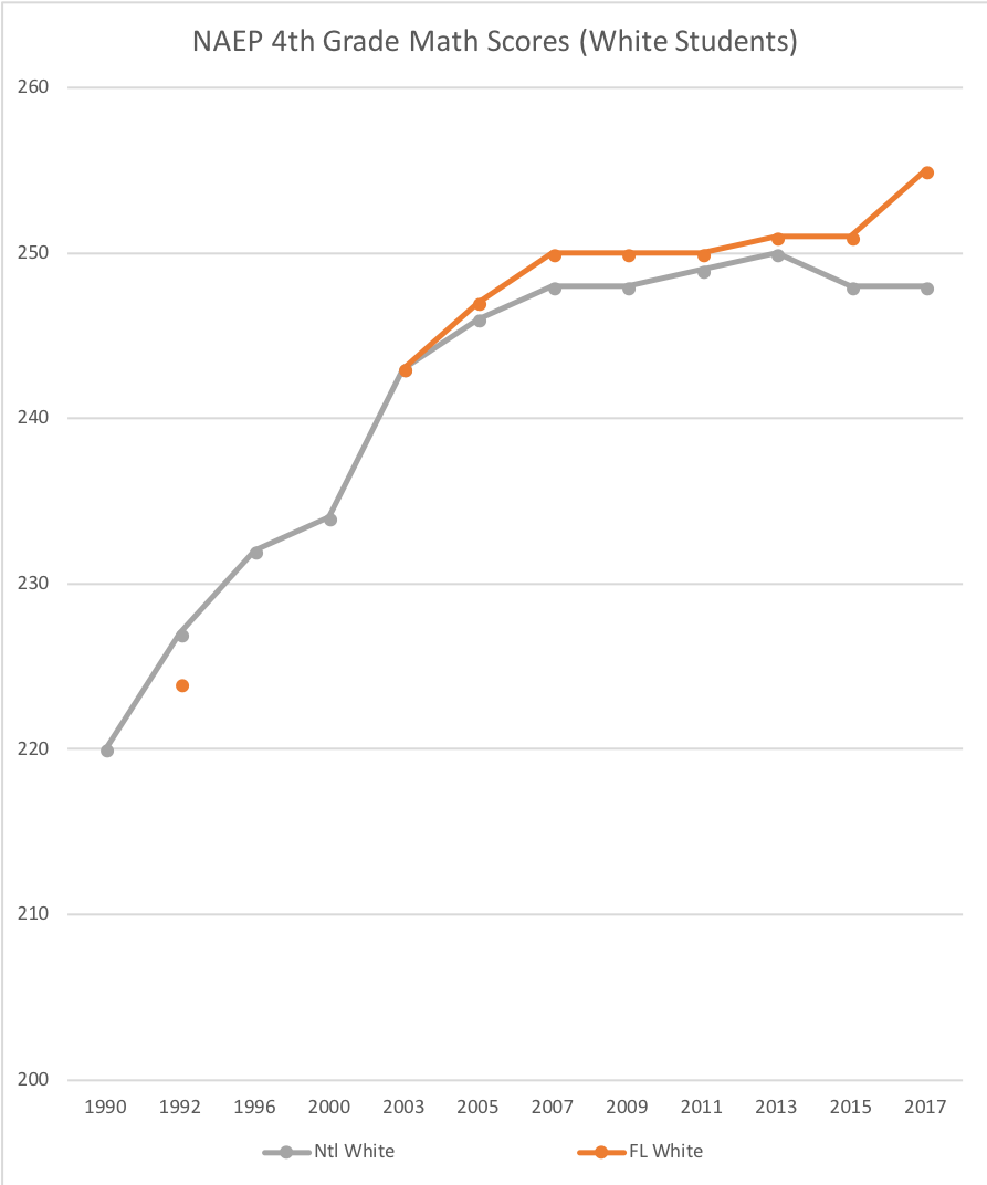 White fourth-graders in Florida have also been almost exactly in sync with their White peers in math, but like Black students, they appear to be pulling away as of 2017.