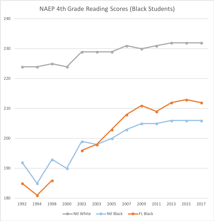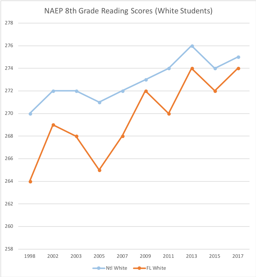Black and Hispanic eighth-graders also generally outperformed their national peers, but not quite as well as fourth-graders. White eighth-graders in Florida have struggled to keep up with the national average in reading, but are definitely closer to closing that gap.