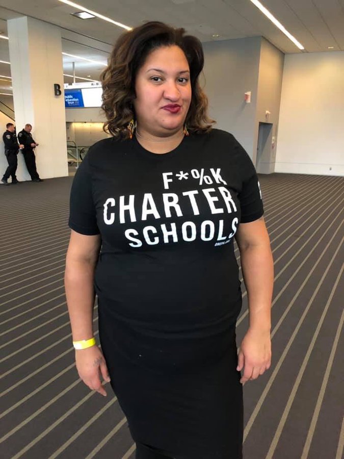 Why were they outside in the rain? Because the candidates, with the sole exception of Mike Bennett, refused to walk down the block and meet with them in a hotel room paid for by a GoFundMe campaign. Inside, audience members wore “F*%k Charter Schools” tee-shirts.