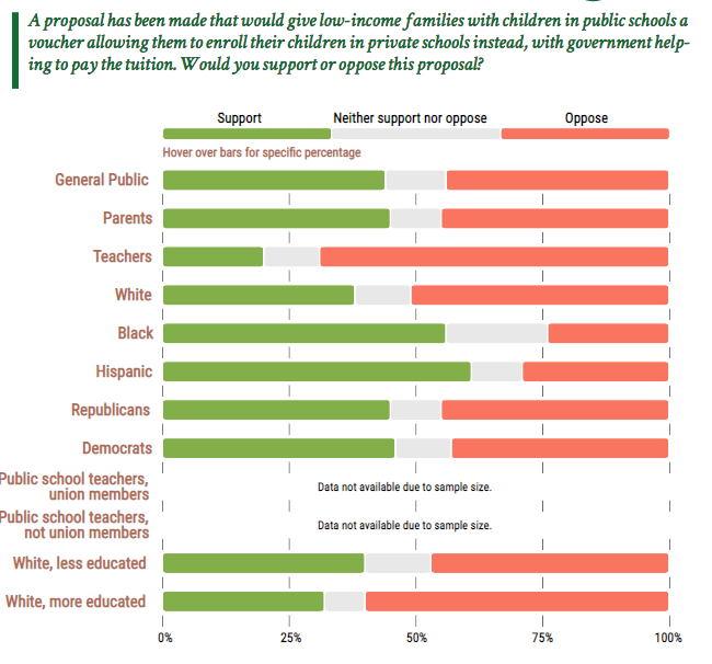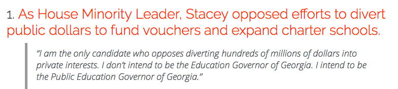 Oprah helped to propel the issue of school choice into the mainstream and she has been a vocal supporter of parents, especially low income ones, having choices about the schools their children attend. Stacey Abrams does not share that view. In fact, most people who proudly wear the progressive label are opposed to all versions of school choice. They are adamant about the need for more funding and even more adamant that only one kind of school is entitled to those public dollars. Did you see Alexandria Ocasio-Cortez’s tweet about the recent teachers’ strike in Los Angeles? https://twitter.com/AOC/status/1084912346823385088?ref_src=twsrc%5Etfw Or the tweets of every Democratic 2020 presidential hopeful who had declared by the time of the strike? They were unanimous in their blind support for the striking teachers but had nothing to say about the families left scrambling or the schools that have had staggeringly low student outcomes for generations. Parents—especially Black and Hispanic parents—support school choice in large numbers. And in Georgia, as recently as 2012, more than two thirds of Georgia voters demanded more educational choice at the ballot box—and the support was bipartisan with some of the strongest supporters representing Democratic strongholds in urban Atlanta. Abrams voted against the constitutional amendment to make the state of Georgia a charter school authorizer and she opposed the creation of an Opportunity School District that would have allowed for a state takeover of the lowest performing schools. The Georgia Federation of Teachers didn’t think that Abrams’ opposition was robust enough or that she had done enough to keep the Opportunity School District off the ballot. She lost their support. The measure defeated by voters anyway. Stacey Abrams has certainly learned her lesson and she has staked out more robust union-friendly positions on education. She has chosen to back only one kind of educational delivery system—traditional zip code zoned public schools—over empowering parents to make the decisions that they believe will best suit their children. And while it may be the politically expedient position to take—especially in the era of Trump— there is a striking cognitive dissonance between her tireless advocacy for the voting rights of African Americans and her opposition to giving African-American parents some agency over the education of their children. I don’t get it. According to a January 2018 poll of Georgia voters, education is the “single most important issue facing Georgia.” And according to every poll I’ve seen, African-American voters are much more likely to support charter schools, vouchers, and education savings accounts than they are to oppose them. The same is true of Hispanic voters. And White voters too, though to a lesser extent. (All photos are below are from the 2018 Education Next poll here.) The Georgia Education Association, a state affiliate of the NEA, was one of Abrams’ biggest cheerleaders in her race for governor. The first reason they cited for supporting her candidacy? Her opposition to vouchers and charter schools. The image below is cut and pasted directly from the NEA website: Abrams is a courageous risk taker by nature—we can see it in her life trajectory and in her campaign for governor. But when it comes to her education platform, that innate courage and willingness to take risks quickly evaporates. I sincerely wish Abrams well tonight as she tackles the tricky job of delivering the State of the Union rebuttal while at the same time hoping that she changes course on education and joins in the fight to give parents the agency to choose the school that is best for their child.