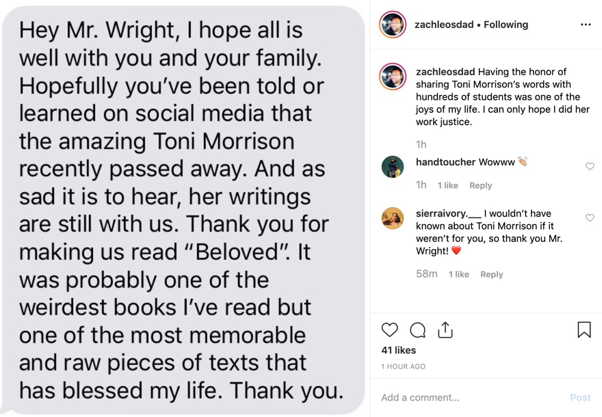 Less than an hour later, the texts rolled in; texts from former students recalling memories of reading “Beloved” and “The Bluest Eye” and “Recitatif” in my classroom; expressions of gratitude for exposing them to such challenging and necessary works.