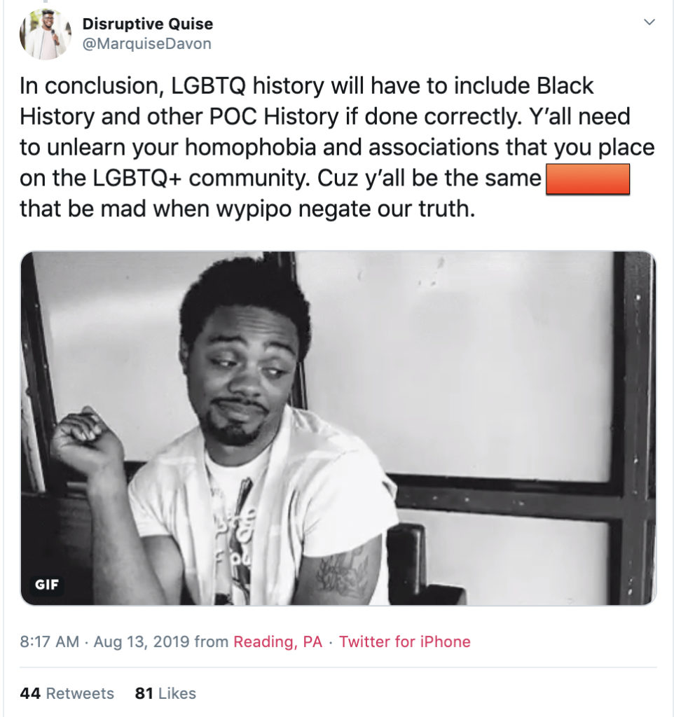 And I hate to break it to y’all but our history is intertwined with LGBTQ history. There are and have always been gay Black people at the forefront of all of the liberation movements. It’s called intersectionality.